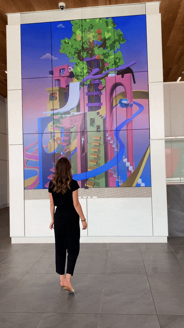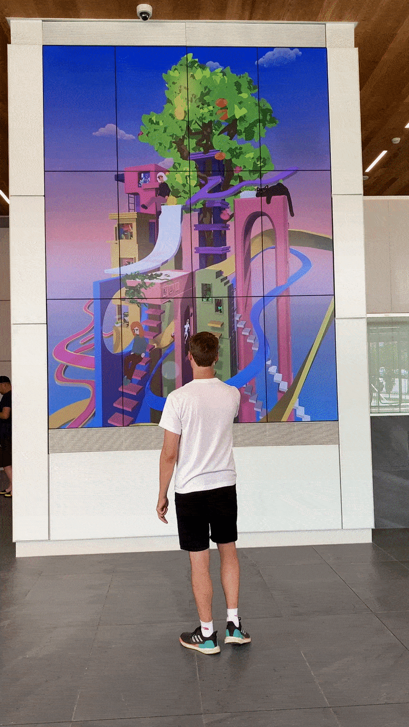 Low Tide Properties’ newest building’s lobby at 565 Great Northern Way, Vancouver is home to a large-scale interactive media wall that was envisioned as a blank canvas for local digital artists to create interactive art pieces that drive community engagement. The project’s goal was to create an underlying framework for the media wall’s hardware to make it easier for artists to create interactive content in the future. Also, we had the opportunity to create the first digital piece that showcases the capabilities and potentials of the media wall and the sensors.